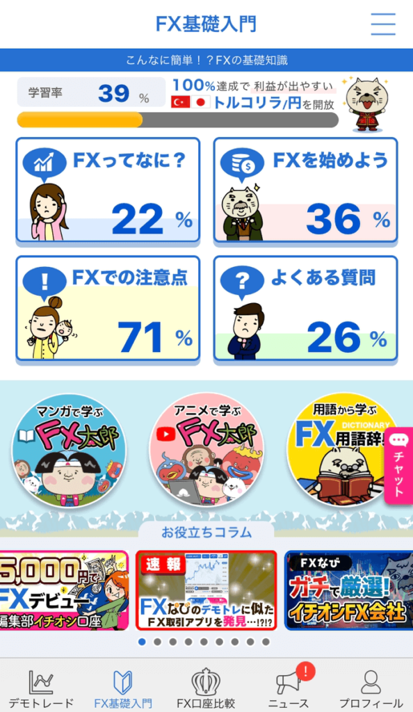 - 基礎的なFXを学ぶのにぴったりな講座が網羅されている