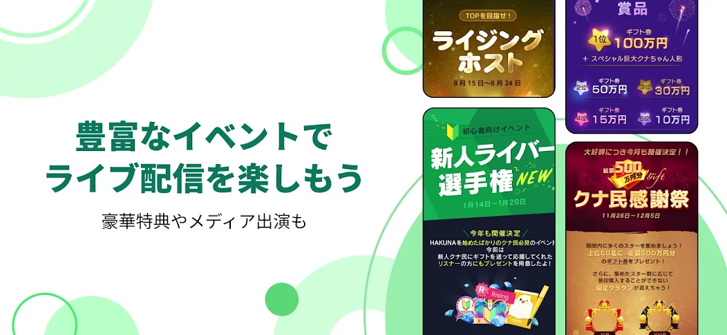 初心者向けのイベント「新人ビデオライバー選手権」や「オーディションイベント」などの、様々なアプリ内イベントが開催中。