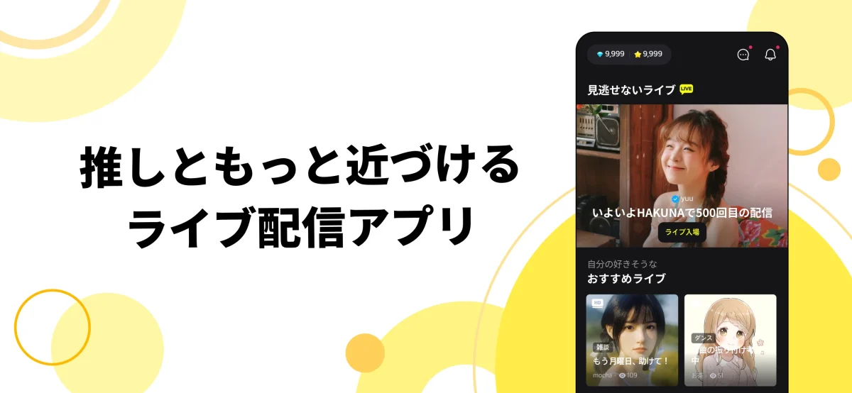HAKUNA(ハクナ)は、「推しともっと近づける、ビデオライブ配信アプリ」をコンセプトとしたビデオライブ配信アプリです。