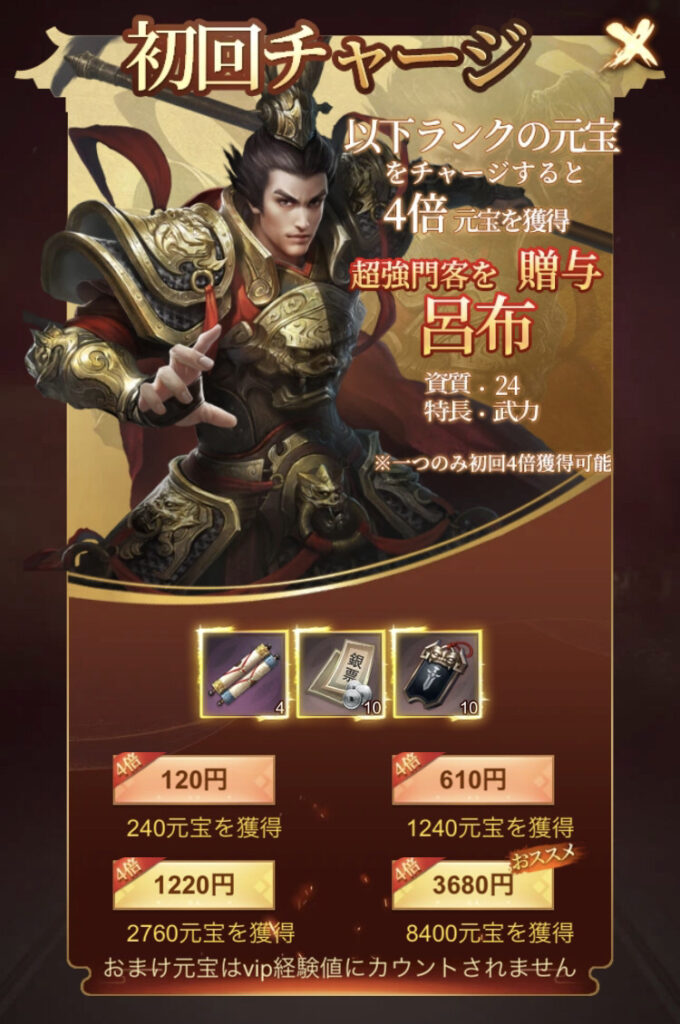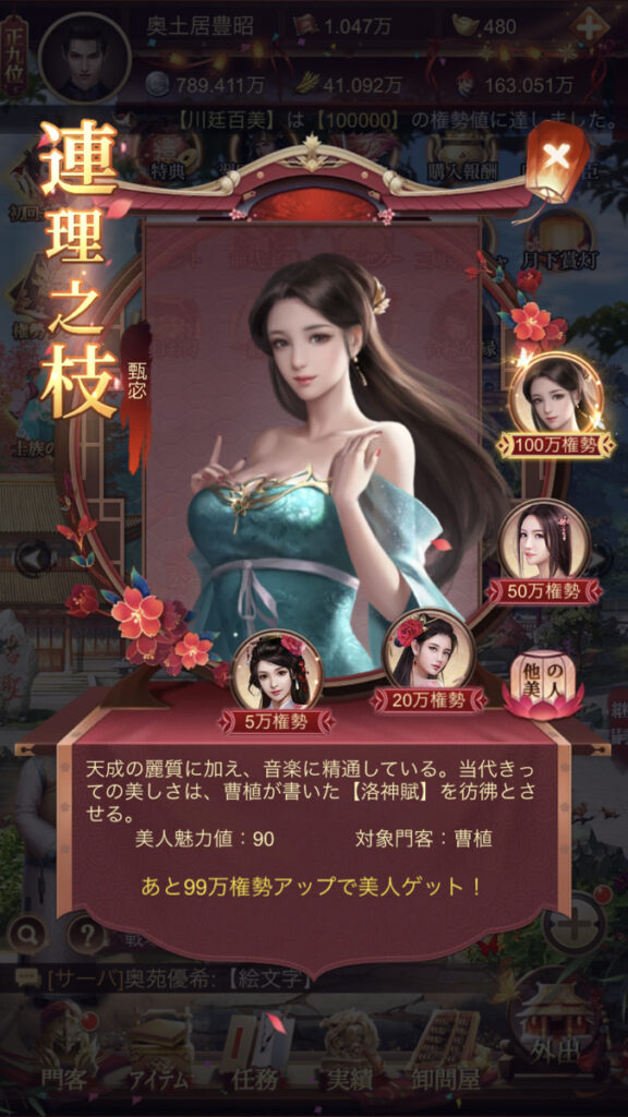 また、課金額によってVIPというステータスがあり階級ごとに門客や美女の特典が貰えるので、その場で課金して終わりということがないのも嬉しいですね。
